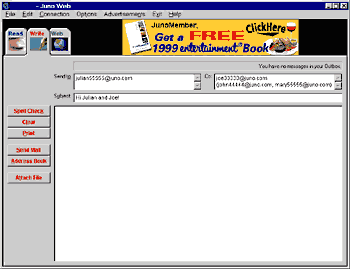 Other miscellaneous questions | Learn what a blind carbon copy is and how to send one in Juno 4.0. | | Find out about Juno's new sound capabilities, including how to turn them on or off. | | You will see a new Juno icon on your computer screen. It will also appear in the Juno title bar once you have entered your account, color-coded to the level of service you have selected. | | Juno 4.0 indicates how you have sorted your messages with an embossed triangle in the column header. | | If you participate in mailing lists or other public forums, you may be worried about strangers seeing your full name. You can set Juno 4.0 to include only your email address, not your name, in the From line of outgoing messages. | | This problem was a bug that has been corrected in the latest version of Juno. |