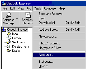 Note: Due to limits placed on your mailbox, you must complete the following steps to prevent your mail from being blocked or deleted. - From the Tools menu, select Accounts.