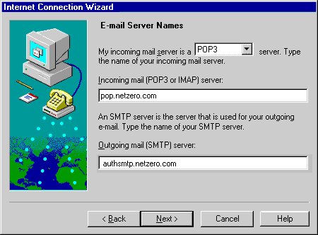 - In the Outgoing mail (SMTP) text box, type authsmtp.netzero.com.