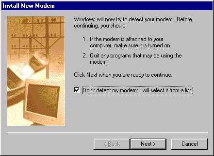 - Check the box for Do not detect my modem; I will select it from a list and click Next.
