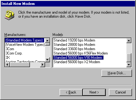 - Select Standard Modem Types on the left, and select Standard 28800 bps Modem on the right. If you have Windows 98 and a 56k modem, select one of the Standard 56000 bps modem choices, depending on whether your modem supports x2 or Kflex.
