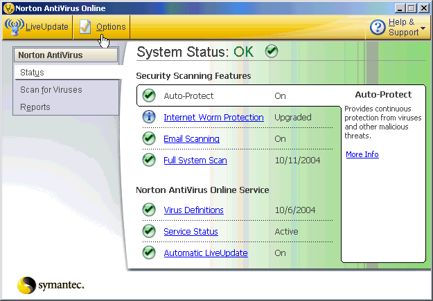 Related Items: How do I Install and Activate Norton AntiVirus Online? How do I activate my Norton Program? How do I scan for viruses in Norton AntiVirus Online? How do I Enable or Disable Auto-Protect in Norton AntiVirus Online? How do I Enable or Disable Email Scanning in Norton AntiVirus Online? How do I Enable or Disable LiveUpdate in Norton AntiVirus Online? How do I Uninstall Norton AntiVirus Online? Return to Norton AntiVirus Online - Frequently Asked Questions page