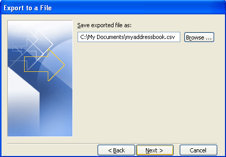 - Choose a location to save the file by clicking on Browse and assign a name to the file (example: myaddressbook.csv).