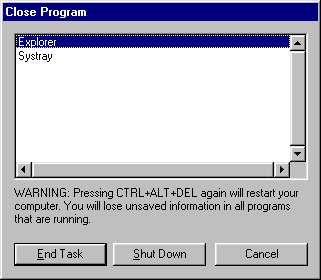 - For every program EXCEPT Explorer and Systray, click once on each program listed to highlight it, and then click End Task.